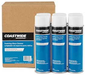 Coastwide Professional foaming glass cleaner in 19oz cans. Six per case with fresh scent. Removes dirt, grease, and fingerprints for streak-free shine.